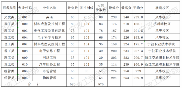 寧波工程學院2020年專升本錄取分數線