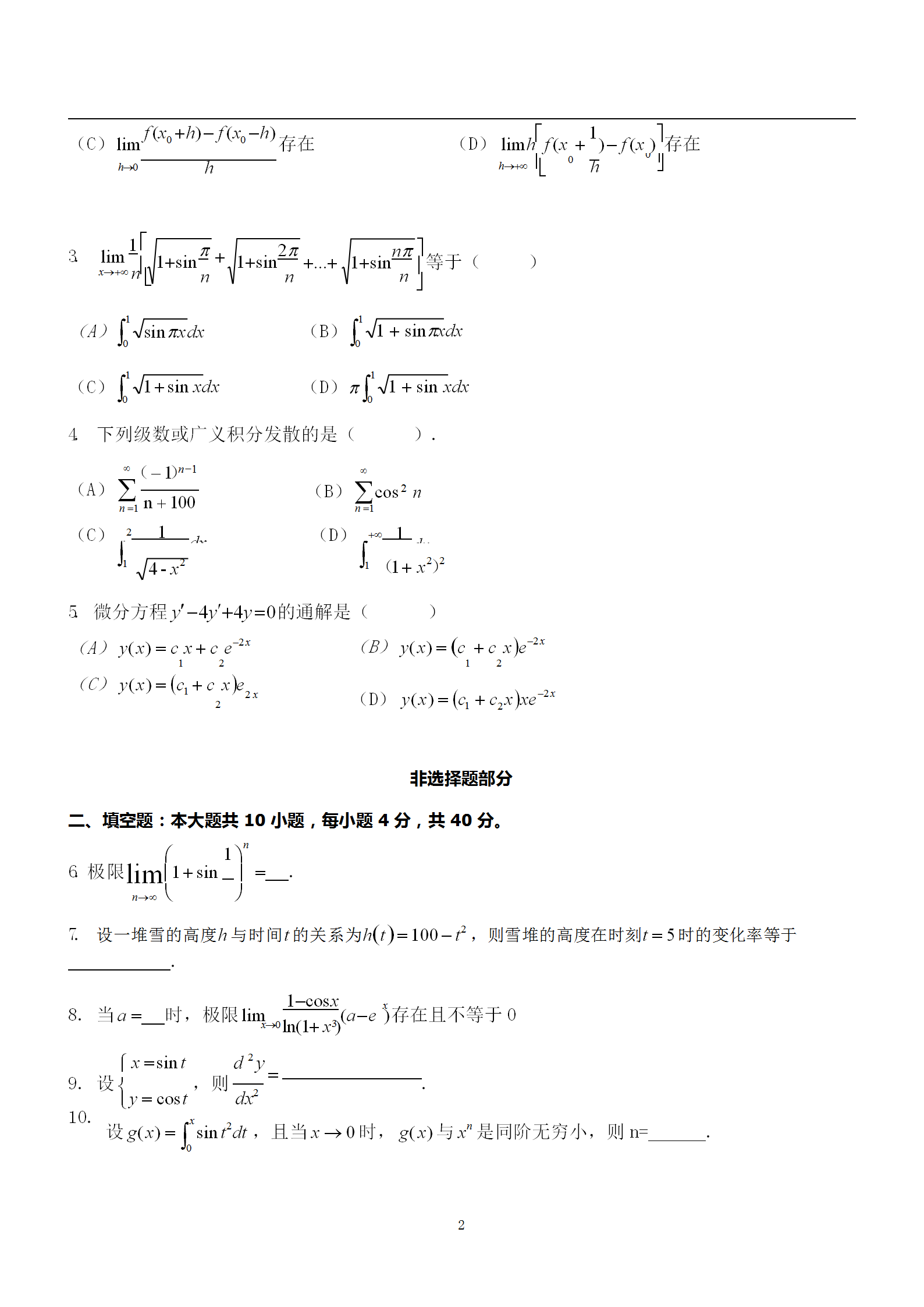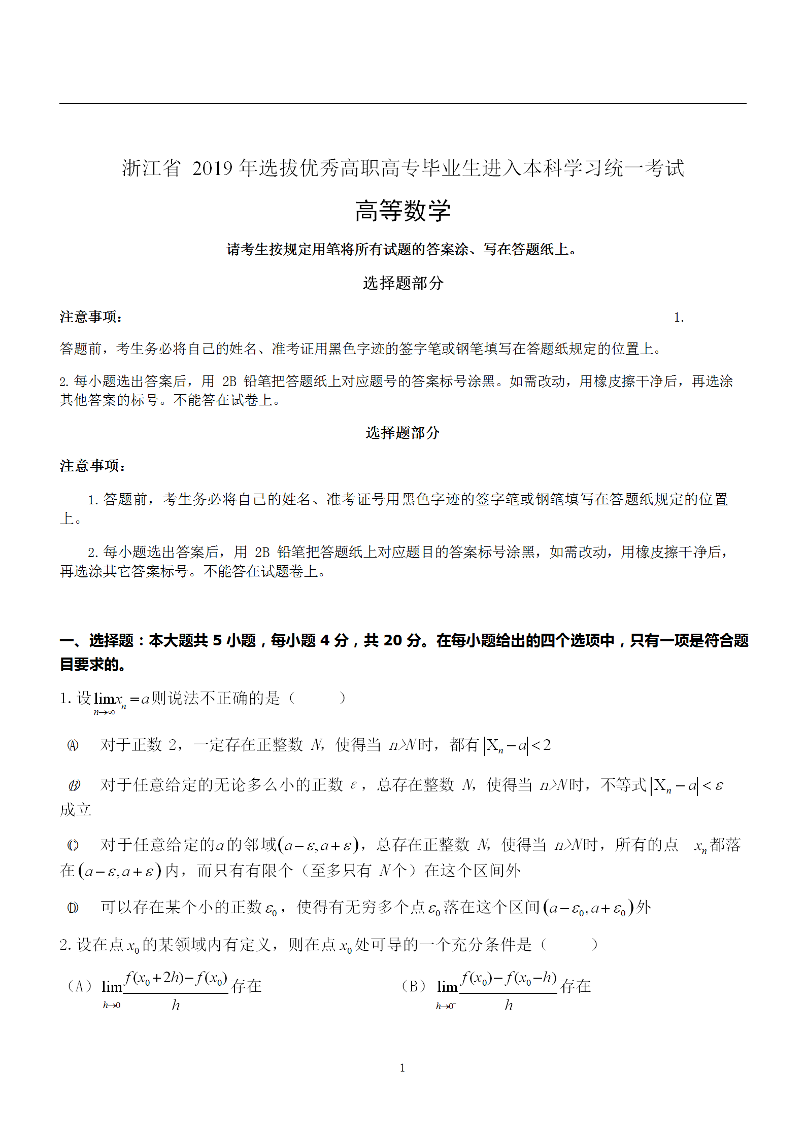 2019年浙江專升本《高等數學》真題卷