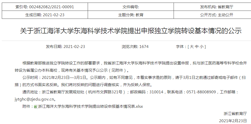2月23日,浙江省教育廳官方網站公示了“關于浙江海洋大學東海科學技術學院提出申報獨立學院轉設基本情況的公示”。