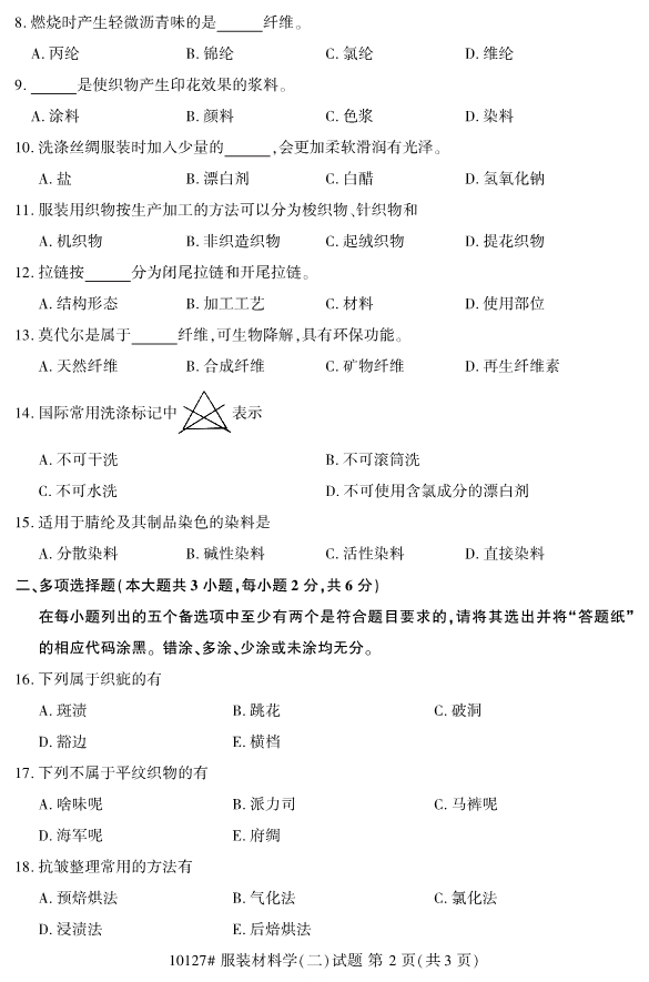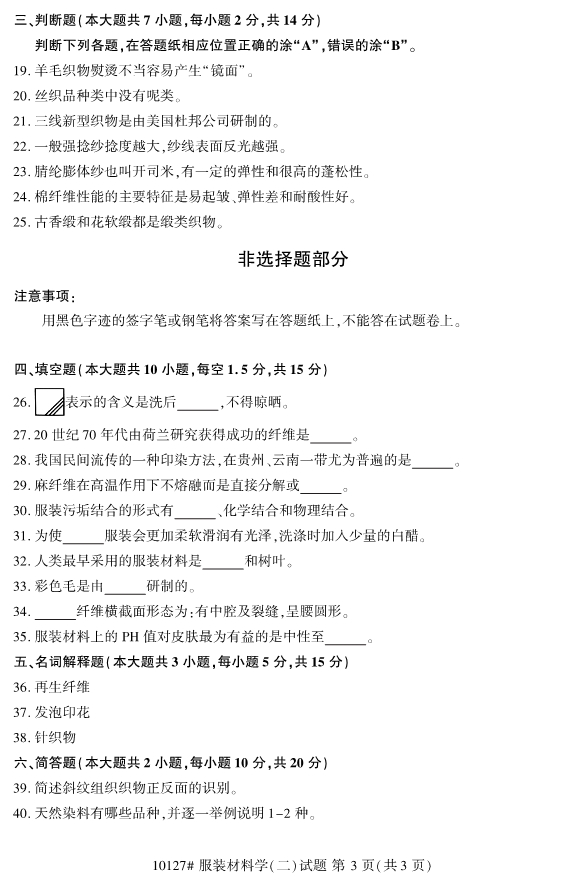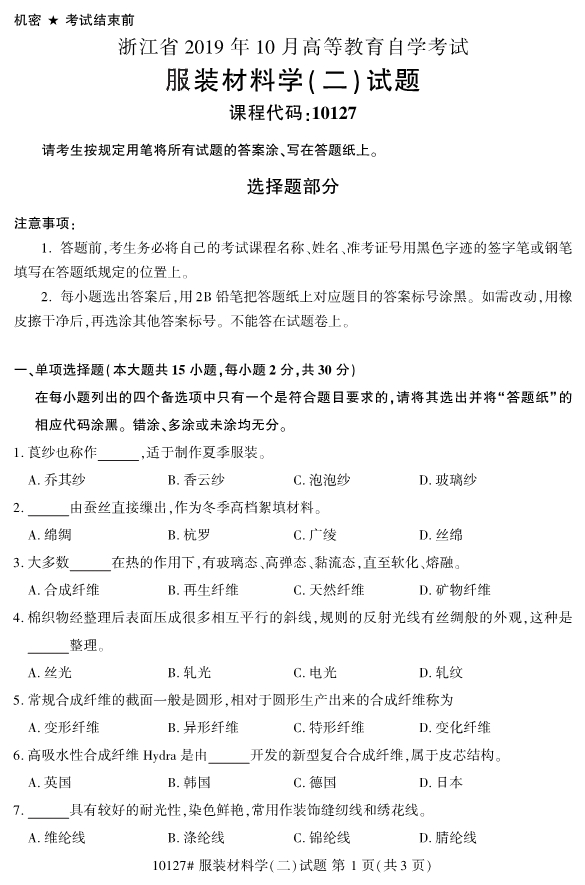 對于考生們來說,現(xiàn)階段就開始進行浙江自考的復(fù)習(xí)備考的話,考生們能夠留給自己復(fù)習(xí)備考的空間越大。同時,考生們可以通過真題的訓(xùn)練來檢驗自己的學(xué)習(xí)成果。為了幫助考生們復(fù)習(xí)備考,浙江專升本整理了2019年10月浙江自考10127服裝材料學(xué)(二)試題。