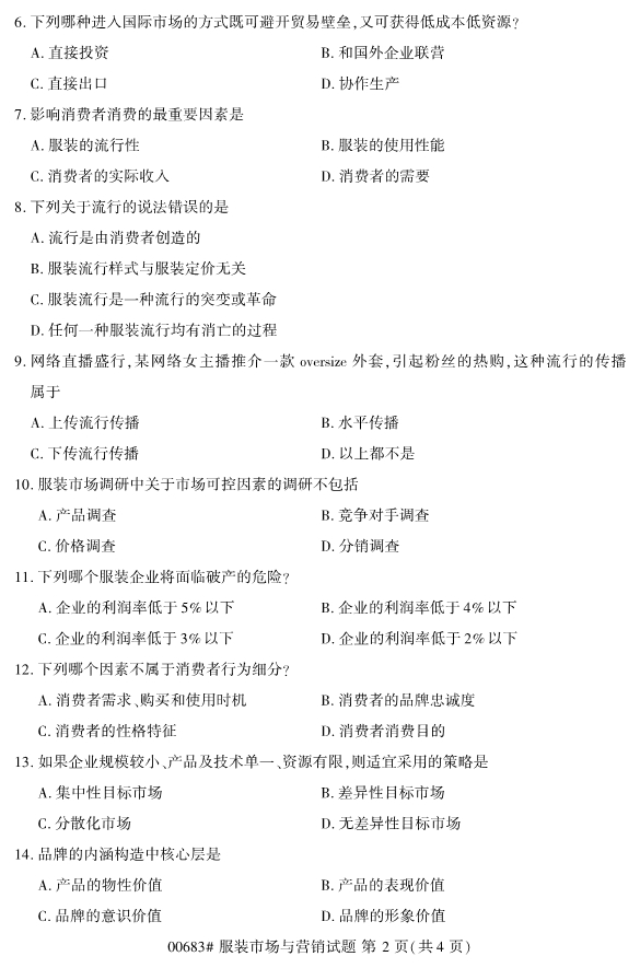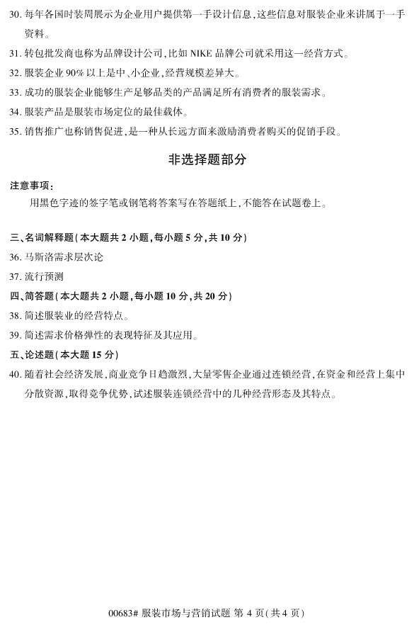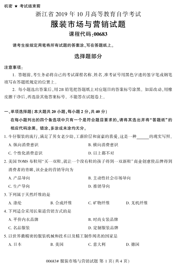 2019年已經要接近尾聲了,但是對于想要報考2020年4月份浙江自考的考生們來說,現階段考生們自考可以開始進行復習備考工作。并且在復習備考中,適當地真題訓練是十分必要的,所以浙江專升本為各位考生們整理了2019年10月浙江自考00683服裝市場與營銷試題。