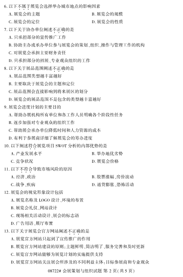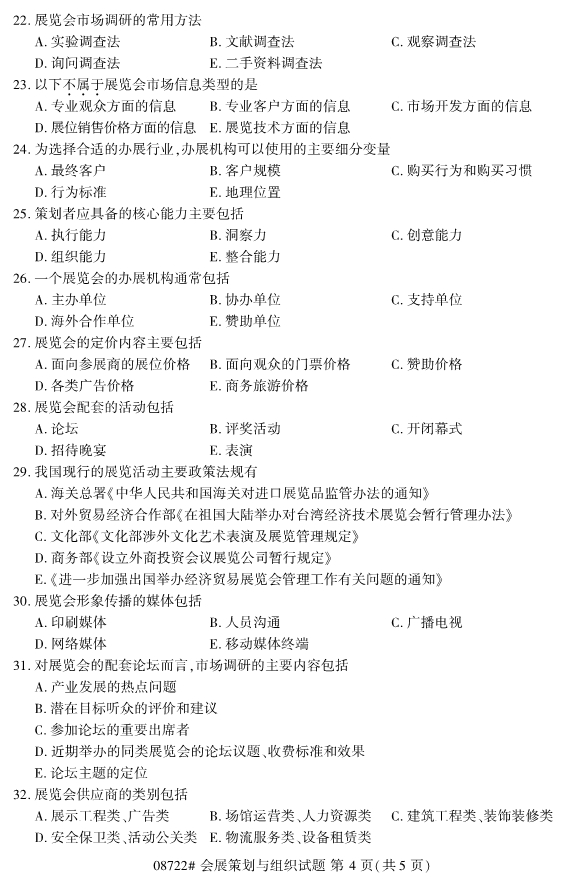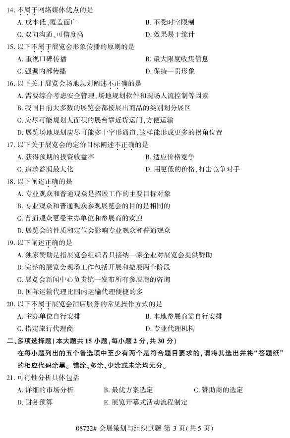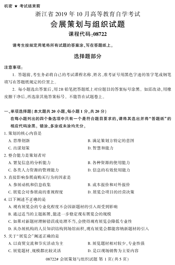 對于選擇報考浙江自考的考生們來說,如何找準復習備考的重點和難點,對于沒有時間準備考試的在職考生們來說顯得尤為的重要,其實考試的常考考點在歷練的真題中都有所體現,考生們要更高效的進行備考工作,不妨在備考過程中做一些真題。今天要和考生們分享的是2019年10月浙江自考08722會展策劃與組織試題。