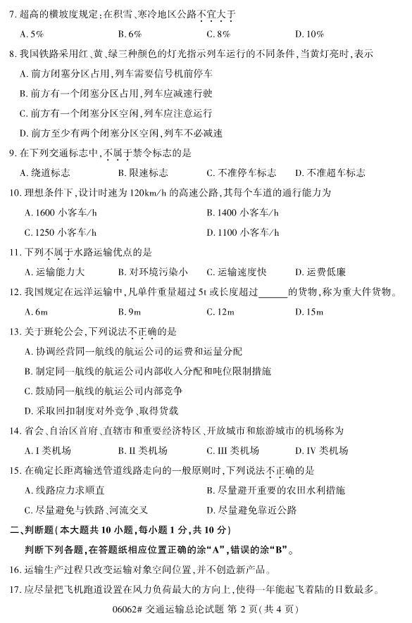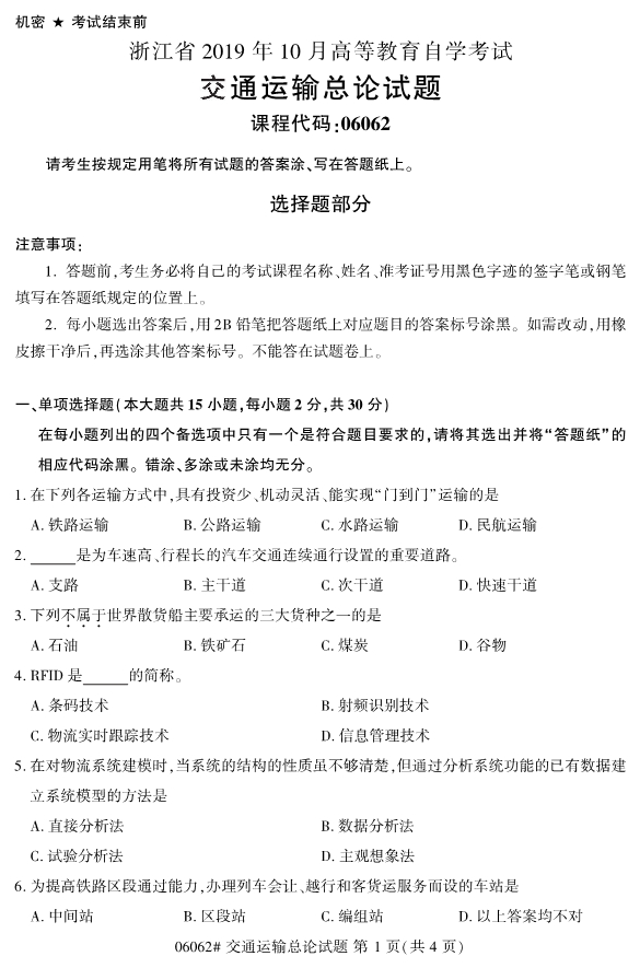 新年的鐘聲即將敲響,2019年也將迎來尾聲,不知道準備報考2020年4月份浙江自考專升本考試的考生們是否已近開始進行復習備考工作了呢?在備考過程中,必要的真題訓練對于考生們的復習備考工作會有很大的幫助。為了幫助考生們備考,小編整理了2019年10月浙江自考06060交通運輸總論試題。
