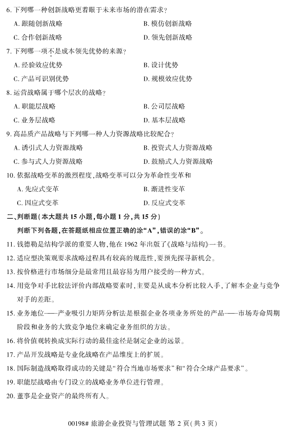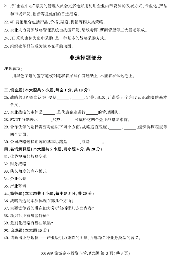2019年即將結(jié)束,2020年即將來臨。想要報考2020年浙江自考專升本考試的考生們,從現(xiàn)階段開始可以確定自己即將要報考的專業(yè)和院校,此外也要做好復(fù)習備考計劃。為了幫助各位考生們備考,小編整理了2019年10月浙江自考00198旅游企業(yè)投資與管理試題。