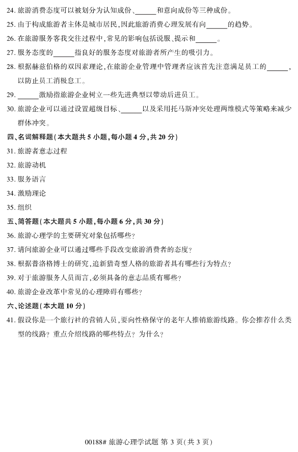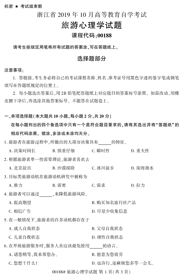 2020年已近來臨,20204月浙江自考專升本考試的報名工作已經開始了。報名工作結束后,留給各位考生們復習備考的時間就所剩無幾了。在復習備考過程中,真題是十分必要的。為了幫助各位考生們備考,小編整理了2019年10月浙江自考00188旅游心理學試題和各位考生們分享。