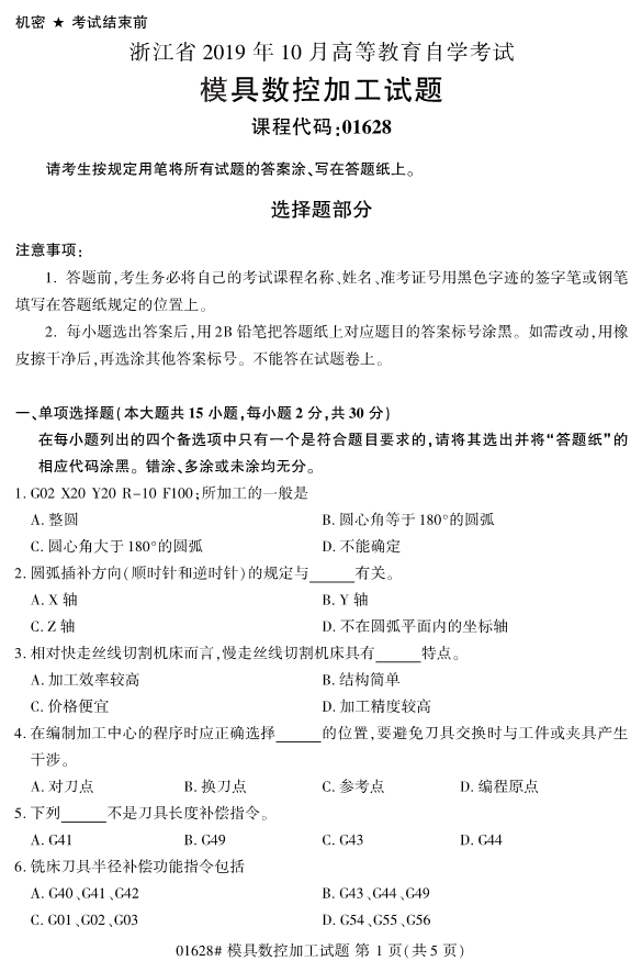 對于考生們來說,雖然還有4個月才會迎來2020年4月份的浙江自考,但是這中間真正留給考生們復習備考的時間其實不是很多。所以,考生們如果想要盡早通過浙江成人自考拿到自考本科畢業證,必須要盡早開始復習備考工作。為了幫助考生們復習備考,小編整理了2019年10月浙江自考01628模具數控加工試題。