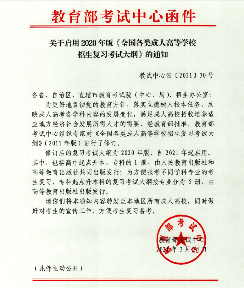 發(fā)布時(shí)間:2021-06-16 瀏覽次數(shù):1985根據(jù)教育部考試中心通知,自2021年起啟用修訂后的2020年版《全國各類成人高等學(xué)校招生復(fù)習(xí)考試大綱》。其中,包括高中起點(diǎn)升本、??频?/div>