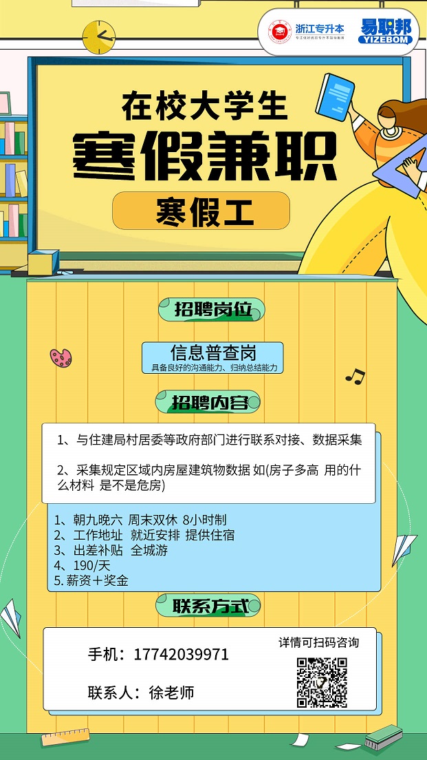 發布時間:2021-12-31 瀏覽次數:1258急招!年前崗位臨時工招聘,數據采集崗!崗位:數據采集崗(一)工作內容1、與住建局、村居委等政府部門進行聯系對接、數據采集2、采集規定區 -