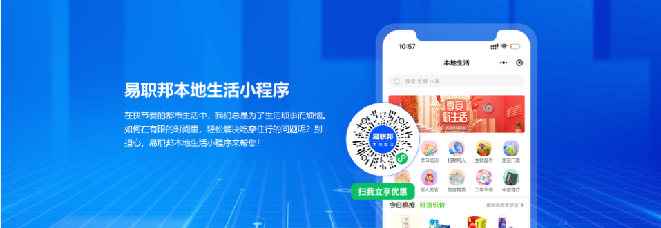 發布時間:2023-09-22 瀏覽次數:1736易職邦本地生活小程序幫你在快節奏的都市生活中,解決生活瑣事的煩惱,幫你在有限的時間里,輕松解決吃穿住行問題。 -